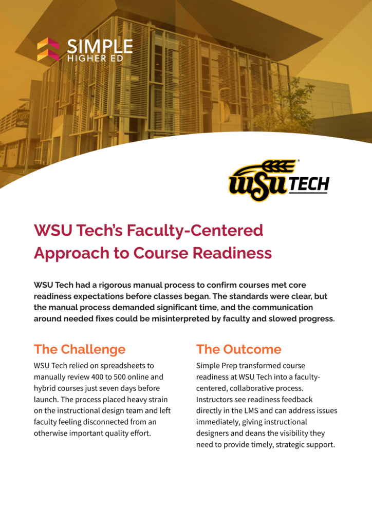 By implementing Simple Prep, WSU Tech enabled instructors and instructional designers to collaborate in a shared course review workflow that promotes visibility, timely support, and instructor agency.