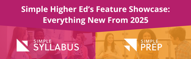 In this webinar, we’ll cover the major updates to both Simple Syllabus and Simple Prep from the past year including improved navigation, enhanced reporting, expanded accessibility tools, and more! If you’re looking to save time and improve consistency across campus, these features will help you meet your goals.
